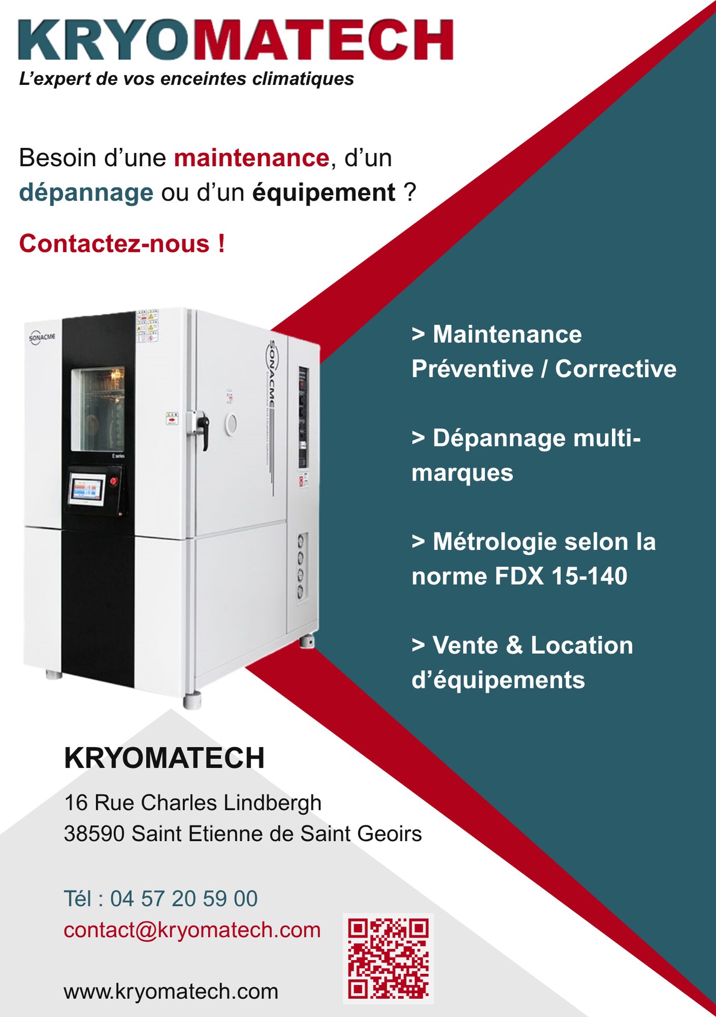 KRYOMATECH est spécialisée dans les technologies du froid spécifique et les environnements climatiques contrôlés. Nous installons, dépannons et assurons la maintenance d’enceintes climatiques et thermiques destinées à des applications industrielles, scientifiques, médicales ou à des secteurs exigeants tels que la recherche, l'électronique, la défense, l'aéronautique et le spatial. Notre large compétence nous permet de proposer de multiples services complémentaires :